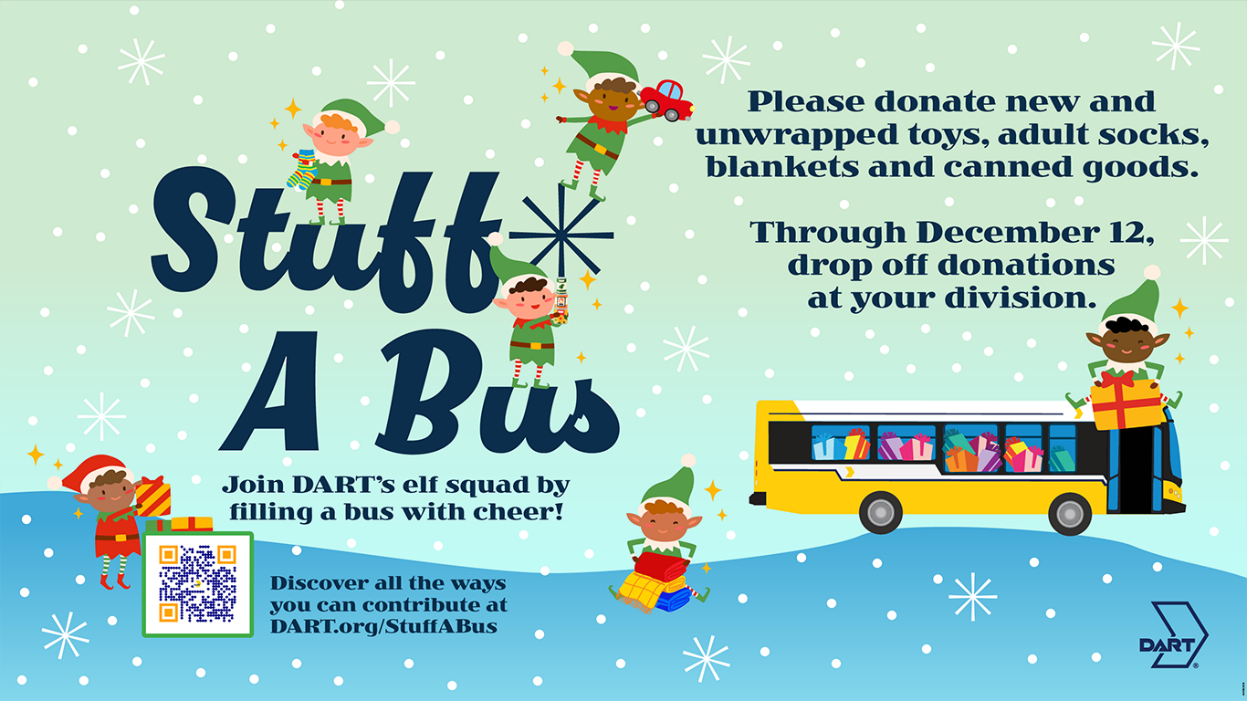 While you’re experiencing the joy of the season, help DART’s elf squad in filling a bus with cheer! It’s a holiday tradition here at DART to Stuff A Bus with new and unwrapped toys, adult socks, blankets, and canned goods. The donations go to seniors and families in need. We encourage you to contribute!