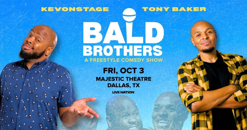 Tony Baker and KevOnStage, the two comedians known as The Bald Brothers, come to the Majestic Theatre. Both have appeared extensively on television, and tonight they bring their act to Dallas. The theater is only a few blocks from St. Paul Station on all four DART Rail lines.